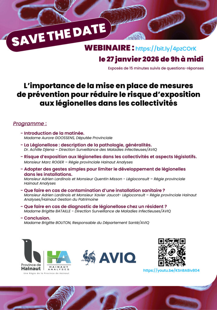 Quels sont les risques d’exposition à la légionellose dans nos institutions? Cette infection respiratoire, qui peut provoquer des pneumonies graves, peut-elle être limitée par des gestes simples? Que faire en cas de contamination? Autant de questions et bien d’autres auxquelles tenteront de répondre des spécialistes lors d’un webinaire organisé par Hainaut Analyses et l’AVIQ le 27 janvier de 9h à 12h. Participation libre et gratuite de tous via le lien indiqué dans le Save the Date ci-dessous.