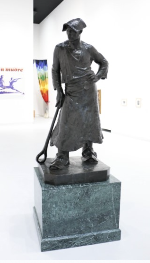 Pour le concours adultes : Le Marteleur de Constantin Meunier, une sculpture représentant un ouvrier au travail, visible dans le bâtiment Zénobe Gramme sur le campus de l’UCharleroi, en face du musée.