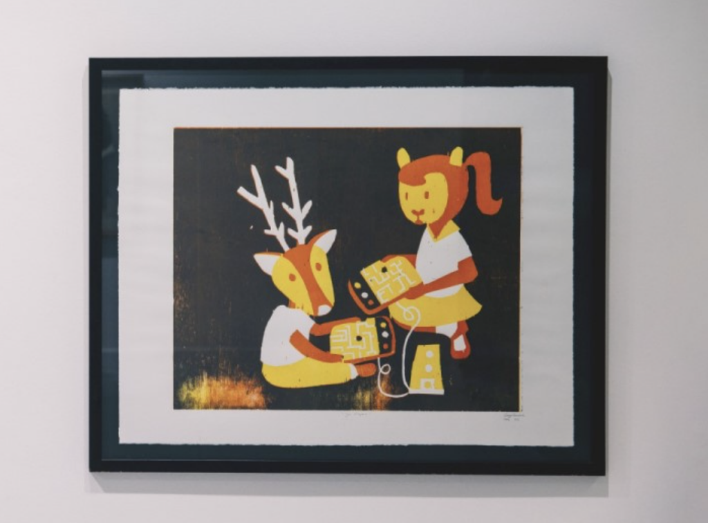 Pour le concours enfants : Jeu avec l’enfant, une gravure de l’artiste hainuyère Laurence Gonry.